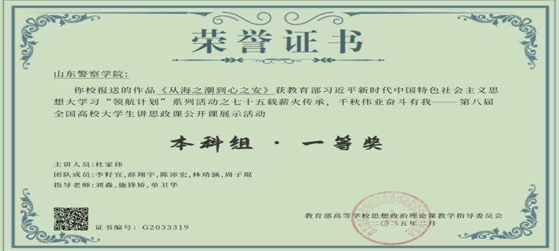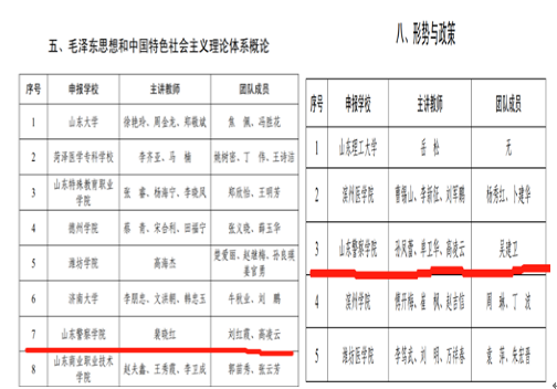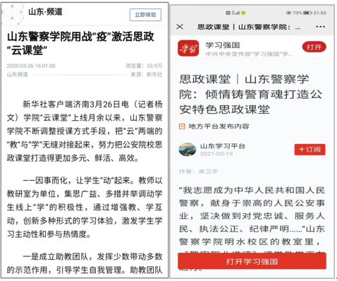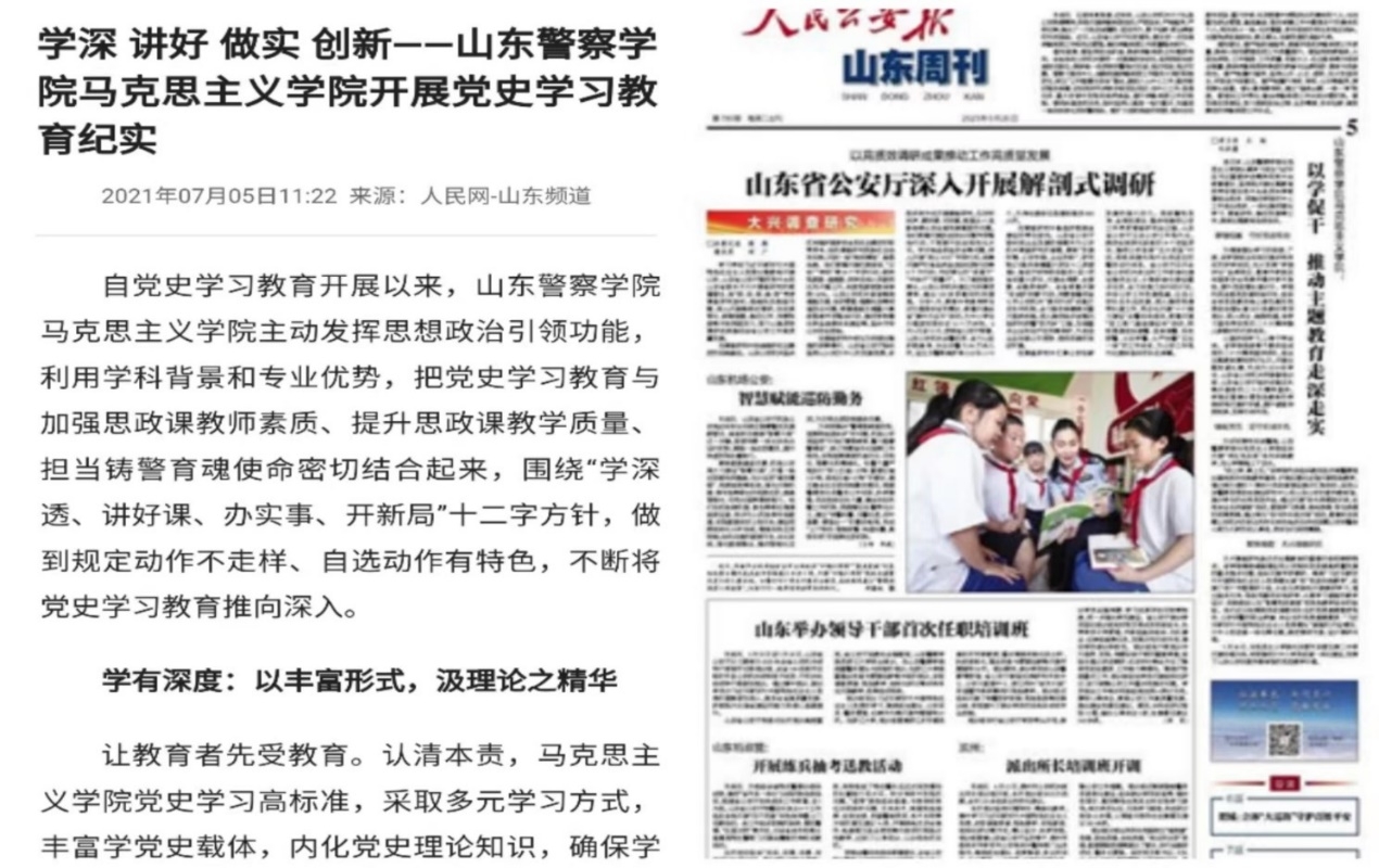 马克思主义学院始终秉持政治建警、政治建校的原则,始终把立德树人作为根本目标,大力实施思政课课堂教学提升行动,全面落实“OBE”教育理念,不断创新课堂教学内容和形式。同时,派出青年教师参加山东高校思想政治理论课“萌新磨课会”,派出教师参加国家及省市的各种培训,提升教学能力。2020年,《山东警察学院用战“疫”激活思政“云课堂”》被新华社报道,阅读量近54万。2021年,特色课堂《山东警察学院:倾情铸警育魂打造公安特色思政课堂》被《人民公安报》、学习强国报道。